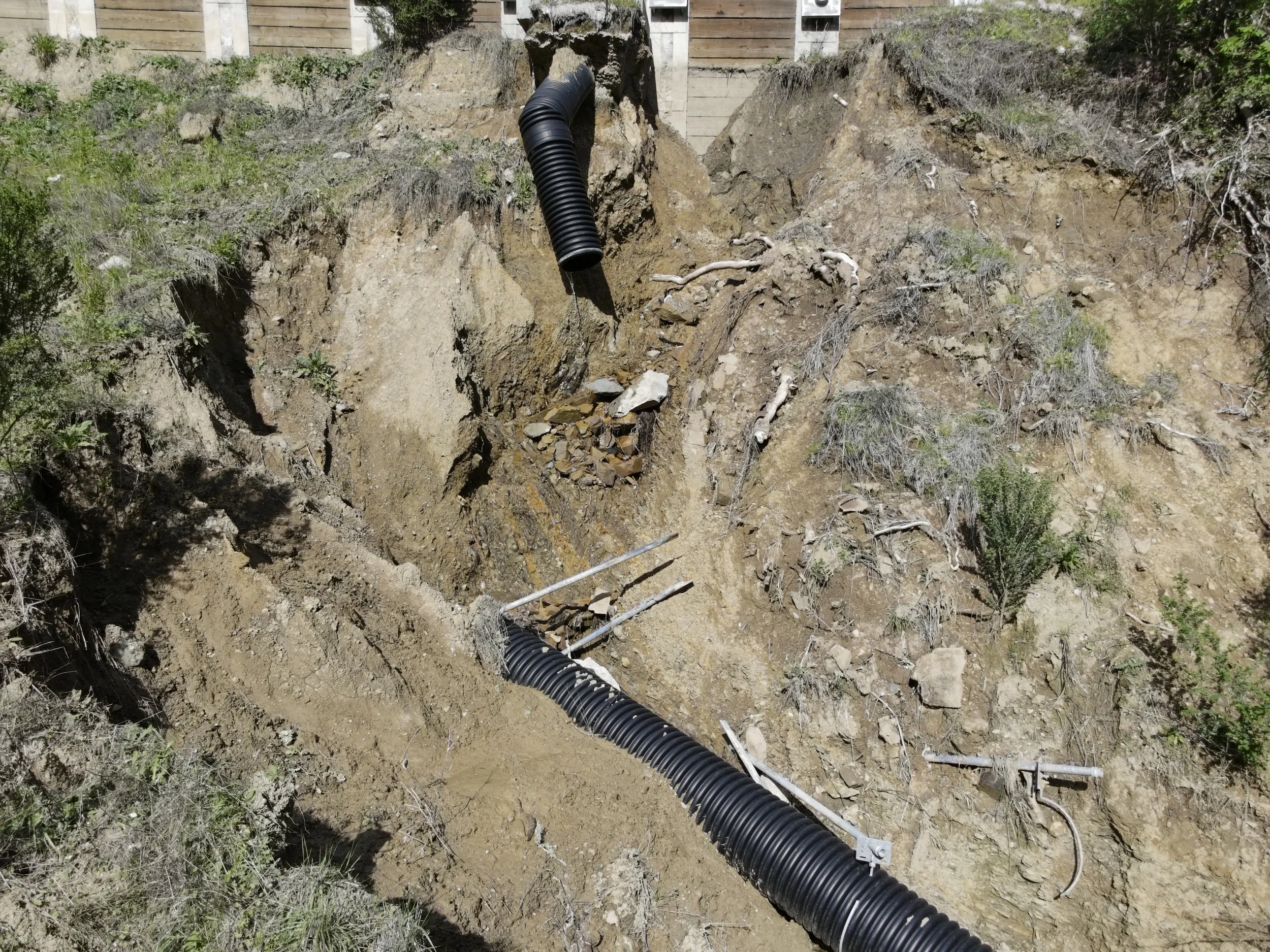 This is the state of the Friars Lane culvert as of March 17th, 2023. The drain pipe has failed due to excess erosion. The culvert had clogged during the weather events of January 2023 resulting in water sheeting over the road, eroding the top soil, and causing the failure.